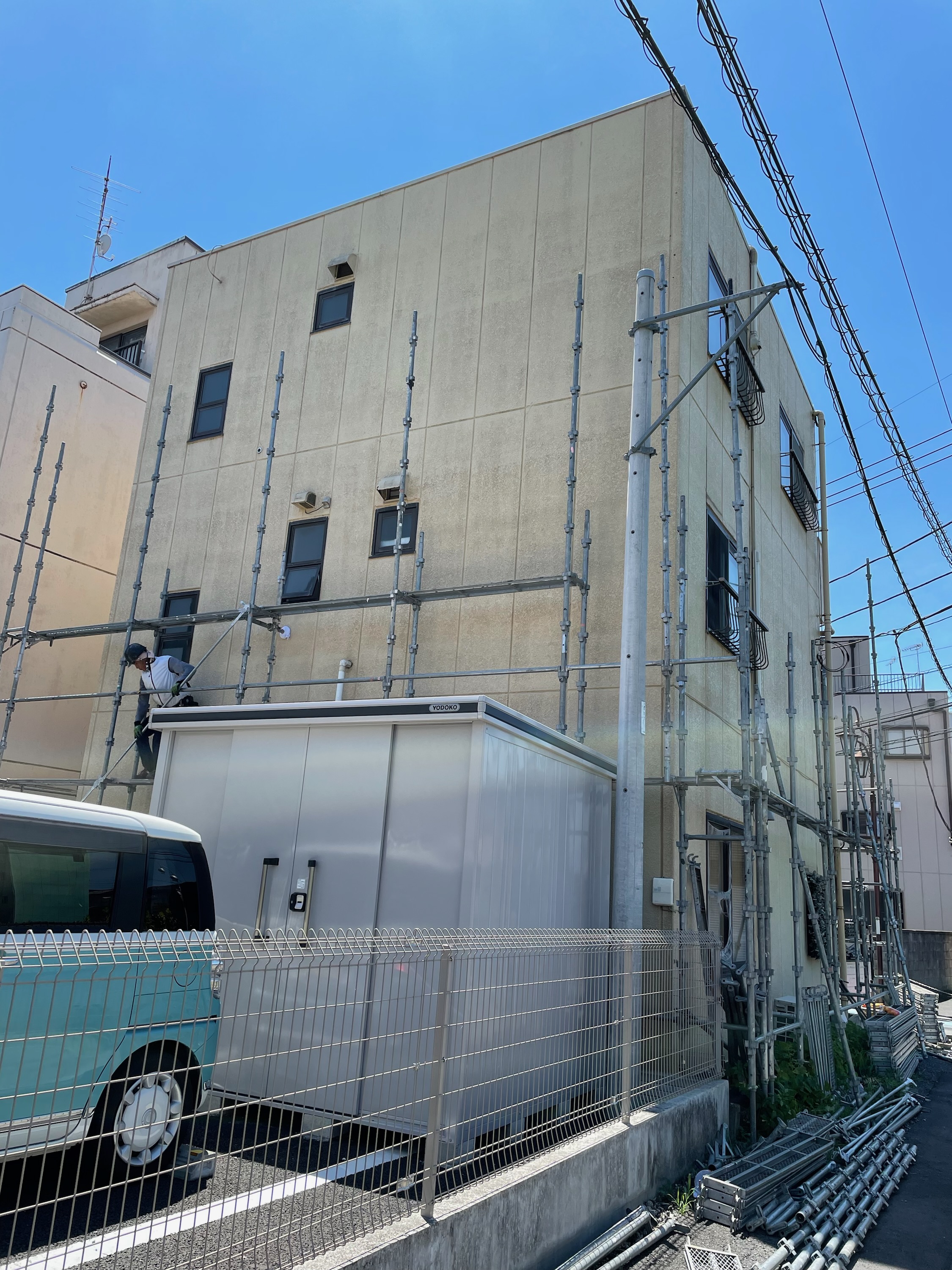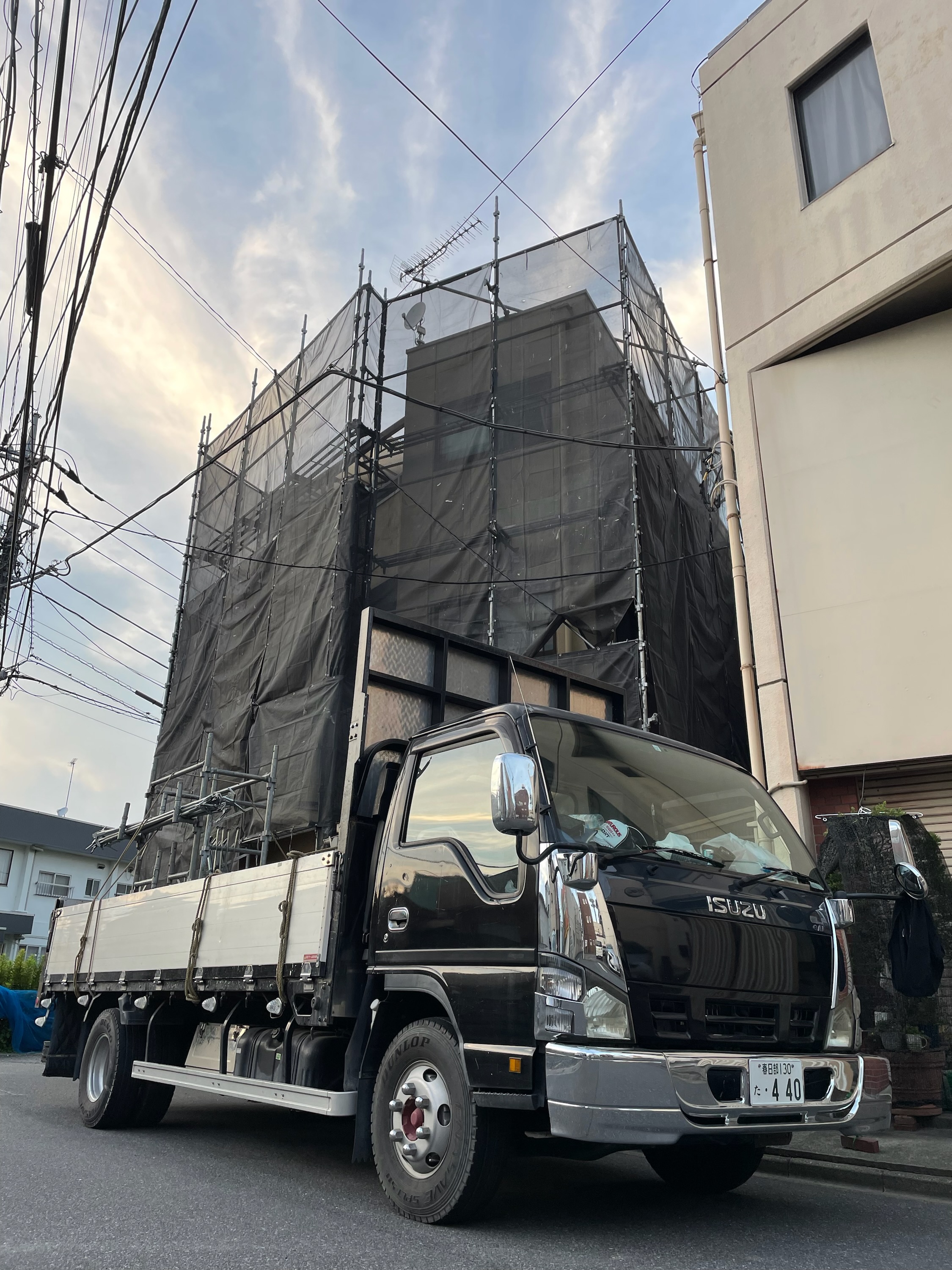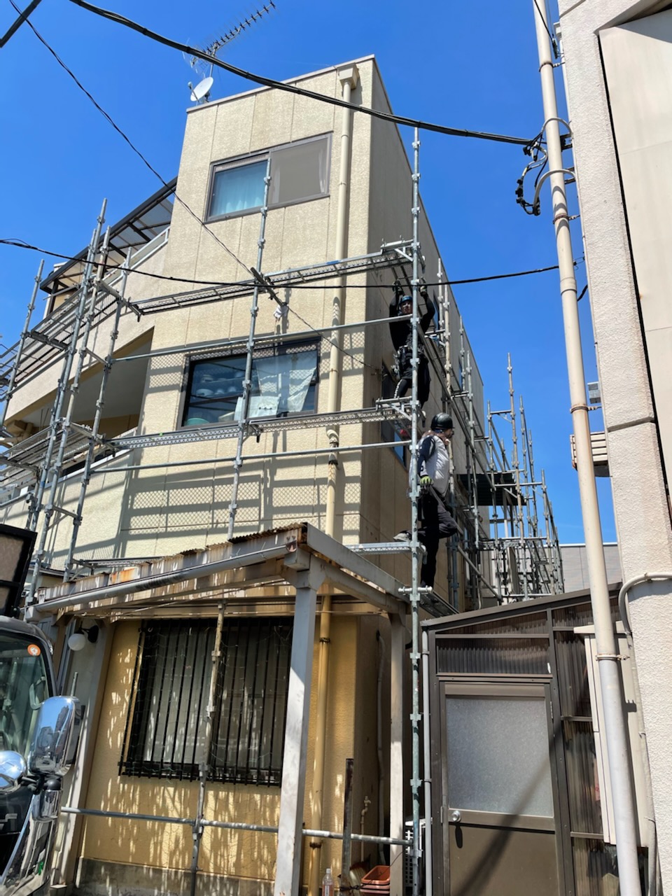 加須市にて、3階戸建住宅の仮設足場を設置中。