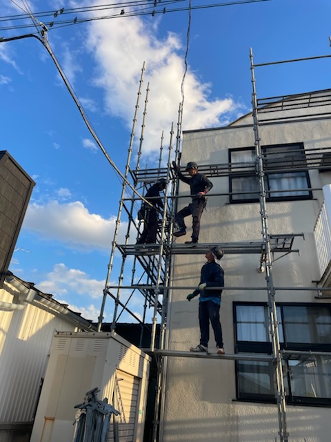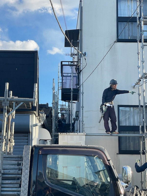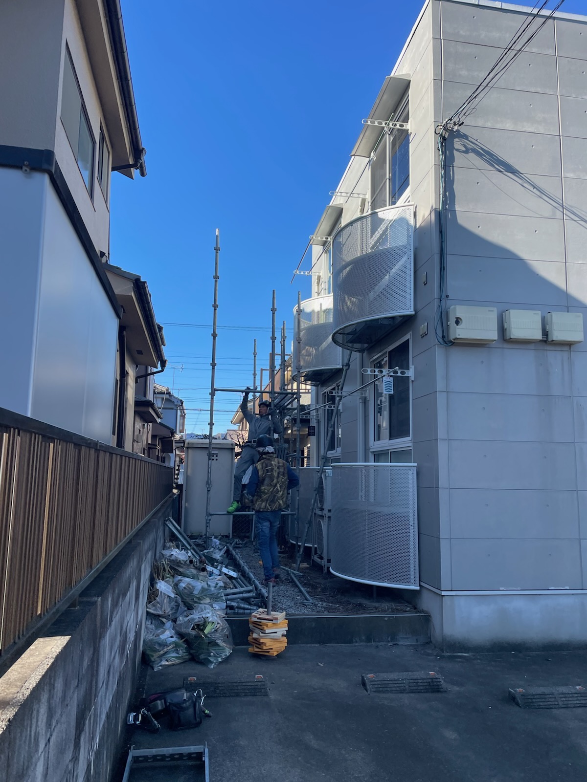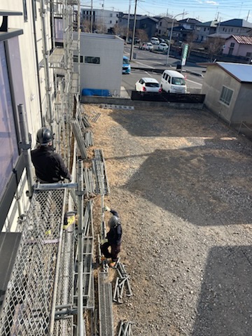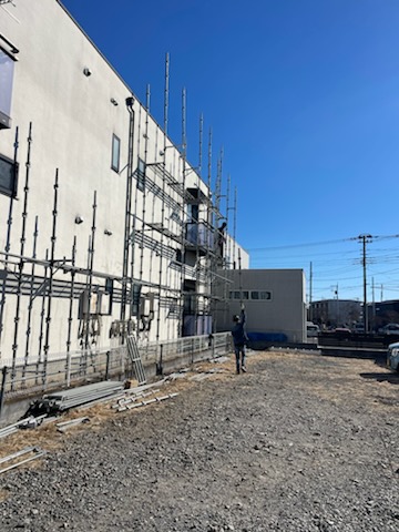 坂戸市にて、アパート改修工事用の仮設足場を設置中。